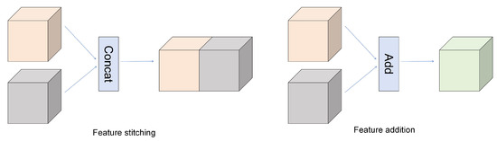 24]. Feature splicing increases the channel count of the output feature layer. For example, if two input feature layers share identical spatial dimensions (e.g., height and width) but have channel counts of p and q, respectively, the spliced output feature layer will have p + q channels. Feature addition maintains the original channel count of the output feature layer. However, this method requires the input feature layers to have identical channel numbers and spatial dimensions; otherwise, the fusion will fail [