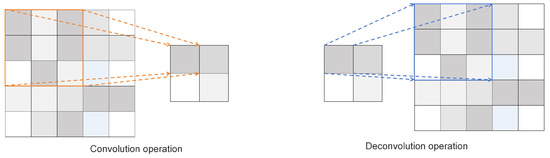 Figure 2 illustrates the region mapping relationship between convolution and deconvolution. The convolution operation is a many-to-one mapping, while deconvolution is a one-to-many mapping that enlarges the size of the feature map. Its calculation formulas are shown in Formulas (