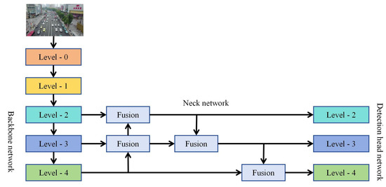 15]. At present, the neck network usually comprises an FPN (feature pyramid network) or variants of an FPN, as in the feature fusion modules bi-directional feature pyramid network (Bi-FPN), adaptively spatial feature fusion [