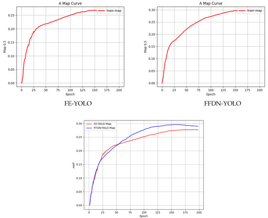 Figure 6 presents a comparative assessment of mAP0.5 between baseline FE-YOLO and improved FFDN-YOLO across 200 training epochs. Quantitative results reveal that FFDN-YOLO achieves a marginally accelerated convergence rate compared with FE-YOLO, ultimately attaining stabilized metric values approaching 0.3 mAP, representing statistically significant evidence of its superior capability in rapid small-object feature acquisition and enhanced validation accuracy, validating the architectural modifications’ efficacy in discriminative pattern learning.