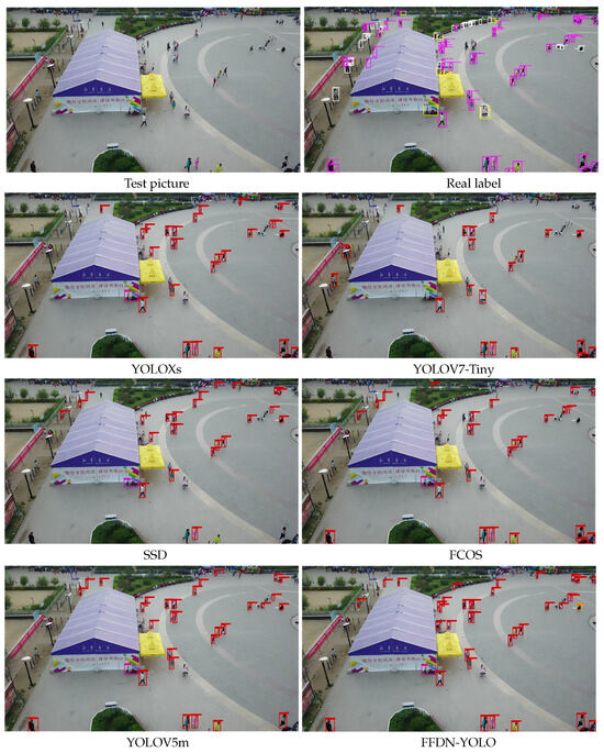It can be seen from the figure that YOLOXs detected 29 objects, FFDN-YOLO detected 39 objects, and SSD, FCOS, YOLOV5m, and YOLOV7-Tiny detected 26, 28, 31, and 20 objects, respectively. Therefore, the number of objects of interest detected by FFDN-YOLO is the highest, and the accuracy of the detection boxes is also improved. This shows that FFDN-YOLO can extract more abundant small object feature information through deconvolutional upsampling. Through the FFDN module, the high-level semantic information is reasonably utilized to help the model better learn the characteristics of shallow small objects, thereby improving the classification and regression accuracy of small objects by the detection head.