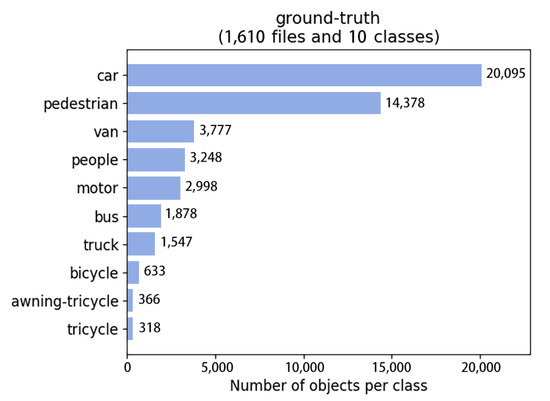 Figure 11. In the case of 1610 samples, the FFDN-YOLO model detected 20,095 car-type targets, 14,378 pedestrian-type targets, 3248 van-type targets, 2998 motor-type targets, 1878 bus-type targets, 1547 truck-type targets, 633 bicycle-type targets, 336 awning-tricycle-type targets, and 318 tricycle-type targets.