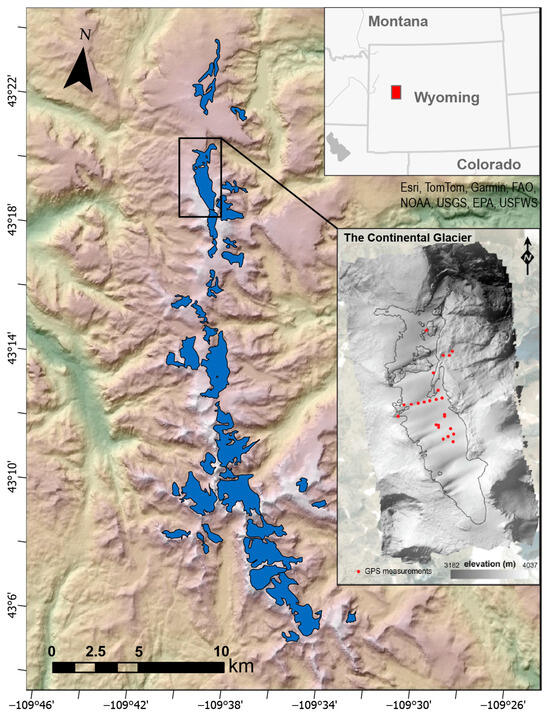 - DeVisser, M.H.; Fountain, A.G. A Century of Glacier Change in the Wind River Range, WY. Geomorphology 2015, 232, 103–116. [Google Scholar] [CrossRef]