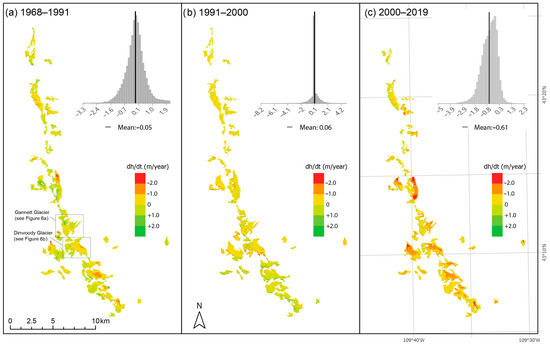 | Time Period | Time Span (years) | dh/dt (m y−1) | dh/dt (m y−1) by Elevation Zones | ||