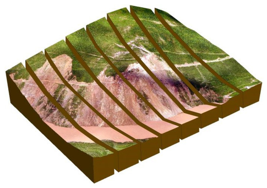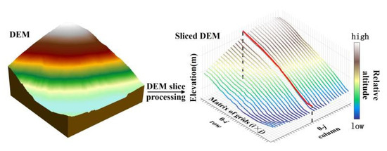 The following section describes the origin of the LIHA. After generating a DEM from discrete points collected via airborne LiDAR, the model can be displayed in the form of a sand table, thereby representing real-world conditions and meeting the needs of geological surveys [13]. The transformation from laser point clouds to a DEM involves a progression from one-dimensional to three-dimensional data; however, if this process is further subdivided, the intermediate two-dimensional state consists of numerous contour lines or horizontal profile lines. To understand the spatial relationships between these profile lines, a DEM can be vertically segmented, like slicing a cake, into several sections (see Figure 1). By fixing each profile line and placing them horizontally, it becomes evident that the undulating terrain is composed of multiple signal waves.