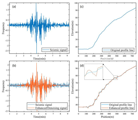 LIHA schematic diagram. (a) Seismic signal; (b) enhanced/denoising signal; (c) original profile line; (d) enhanced profile line.