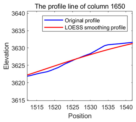 Apply the LOESS smoothing function with 50 data points as the smoothing step size for profile fitting. The LOESS function uses weighted least squares and quadratic polynomial models to fit the terrain trend. Combining this with a smoothing step of 50 data points effectively preserves micro-topographical information. Figure 4 presents the difference between the original profile and the LOESS smoothing profile in column 1650.