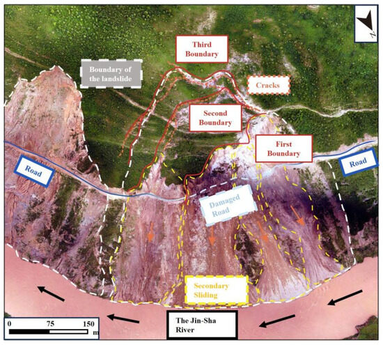 In optical image (Figure 7), the Mengu landslide appears chair-shaped, with a narrow upper slope and a wide lower slope. The landslide front exhibits significant collapses, with exposed bedrock and no vegetation coverage. The mid- and rear sections of the landslide are sparsely vegetated, and the landslide shows a stratified sliding pattern. From top to bottom, it can be divided into three sliding confined boundaries, causing damage to rural roads and forming stepped fault terraces at the rear. Airborne LiDAR imagery, with vegetation removed, reveals a slender fissure developing at the rear top of the slope, which has not yet formed a confined boundary.