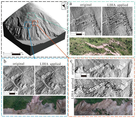 Micro-topographical details enhanced by the LIHA. (a) Enhancement of the landslide rear boundary fissures; (b) enhancement of small-scale secondary sliding above the road; (c) enhancement of landslide boundary features.