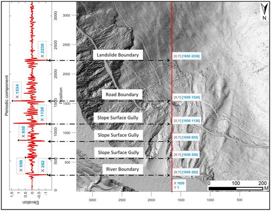 Taking the profile line of column 1650 as an example, the amplified positions of the periodic components correspond to the horizontal coordinates 262, 559, 1138, 1534, and 2236. These positions on the hillshade map represent the locations of rapid topographic changes, such as landslide boundaries, cracks, valley lines, and riverbanks (Figure 9). This result demonstrates that wavelet decomposition is effective in processing signals derived from such terrain profiles. It successfully isolates the natural variations in the terrain and specifically enhances micro-topographical features.