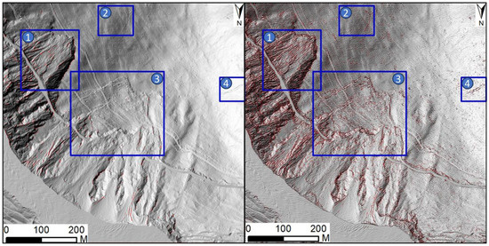 Recognition results of the edge detection algorithm on the hillshade maps before and after enhancement. The regions highlighted by the blue boxes will be detailed in Figure 11.