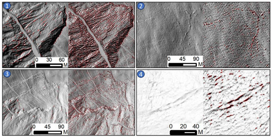 After applying the LIHA, the enhanced hillshade map revealed more complete and detailed micro-topographical features under edge detection. The terrain features identified by the edge detection algorithm were then vectorized, resulting in two vector files. Loading these files into ArcGIS showed that the original hillshade map contained a total of 1907 micro-topographical features, while the enhanced hillshade map contained 37,452 features (Table 1).