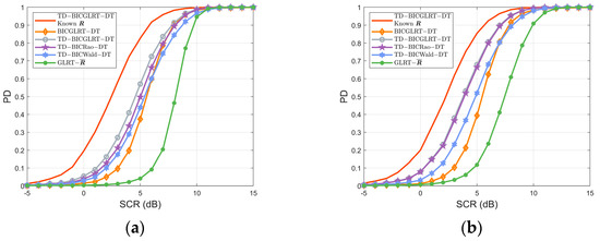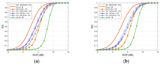 In Figure 3, we investigate the detection performance of the detectors with different numbers of training data under signal energy model 1. As shown in Figure 3a, the curve of the BICGLRT-DT is nearly consistent with that of the TD-BICGLRT-DT and TD-BICRao-DT when SCR is higher than 7 dB. As gets larger, the performance of proposed TD-BICGLRT-DT, TD-BICRao-DT, and TD-BICWald-DT gradually approaches that of the TD-BICGLRT-DT with known . The reason is that the increase in will make the estimated closer to the true , therefore improving the detection performance.