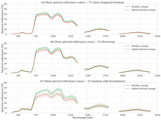Mean and standard deviation of canopy spectral reflectance curves for healthy (green) and aphid-infested (red) winter wheat canopies across three growth stages: (A) T1—stem elongation–heading (BBCH 30–55), (B) T2—flowering (BBCH 55–59), and (C) T3—milky grain development (BBCH 69–75). Each mean spectral reflectance curve is based on 145 samples for T1, 141 samples for T2, and 145 samples for T3. Spectral regions affected by atmospheric noise (1350–1450 nm, 1800–1950 nm, and 2400–2500 nm) and non-informative content (350–400 nm) were excluded.