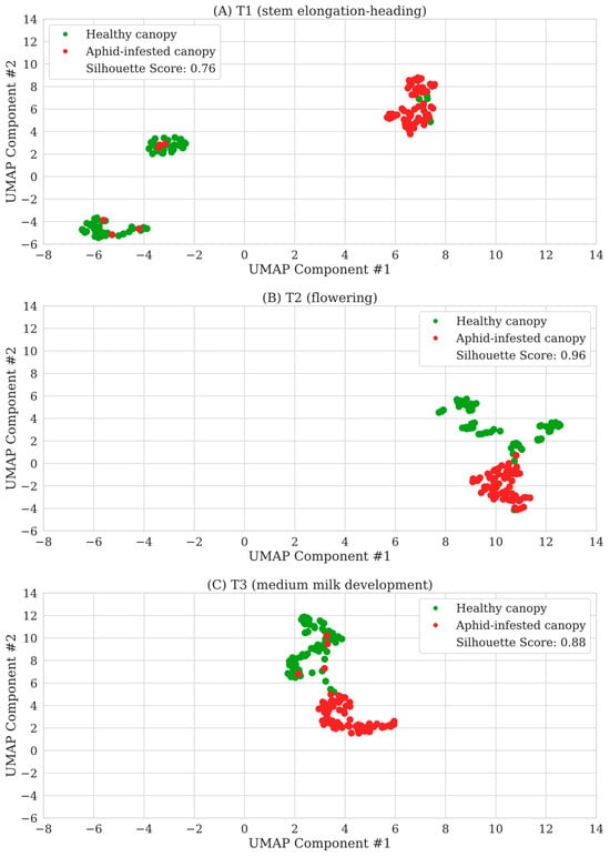 The UMAP visualization (Figure 4) shows clear clustering of healthy (green) and aphid-infested (red) winter wheat canopies across all three measurement stages (T1, T2, and T3). In T1, the clusters for healthy and aphid-infested canopies are relatively distinct but show some overlap, primarily due to a few outliers. This resulted in a silhouette score of 0.76, which is still considered relevant despite being the lowest among all three growth stages. In T2, the separation between the two clusters remains clear, with only minor convergence visible, and a very confident silhouette score of 0.96. In T3, the distribution of samples is similar to that in T2, but with a few more incorrectly classified samples. Consequently, the silhouette score of 0.88, although marginally lower than that observed in T2, remains within a range indicative of high separation confidence. The presented UMAP transformation patterns indicate that differences in canopy spectral responses between healthy and aphid-infested wheat are most pronounced at the T2 growth stage. In T1, these differences remain only subtle, with less distinct reflectance profiles, resulting in less robust transformation of the collected data. In T3, aphid-induced stress signals merge more with natural senescence effects, leading to greater overlap (Figure 4).