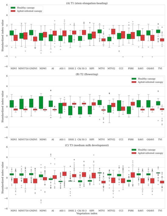 Boxplot distribution of vegetation indices across three growth stages: (A) T1—stem elongation–heading (BBCH 30–55), (B) T2—flowering (BBCH 55–59), and (C) T3—milky grain development (BBCH 69–75) for healthy (green) and aphid-infested (red) plants. Each boxplot is based on 145 samples for T1, 141 samples for T2, and 145 samples for T3.