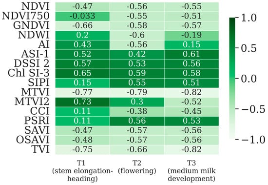In Figure 6, the Point Biserial Correlation coefficients (rpb) for VI are shown across the growth stages T1, T2, and T3. Among all indices, MTVI (rpb = −0.77, −0.79, −0.82) and TVI (rpb = −0.75, −0.66, −0.66 consistently demonstrate the highest correlations with the canopy state across all stages, indicating their strong and stable performance in distinguishing between healthy and aphid-infested canopies.