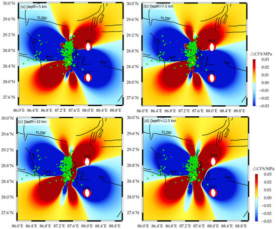 - Lin, J.; Stein, R.S. Stress triggering in thrust and subduction earthquakes and stress interaction between the southern San Andreas and nearby thrust and strike-slip faults. J. Geophys. Geophys. Res. Solid Earth 2004, 109, b02303. [Google Scholar] [CrossRef]