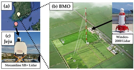 (a) Location of observation sites on the Korean peninsula in Google Maps. (b) View of the Boseong Meteorological Observatory (BMO) and a photo of the Windex-2000 Doppler Lidar (image courtesy of National Institute of Meteorological Sciences, NIMS). (c) Photo of the Streamline XR+ Doppler Lidar in the Jeju site.