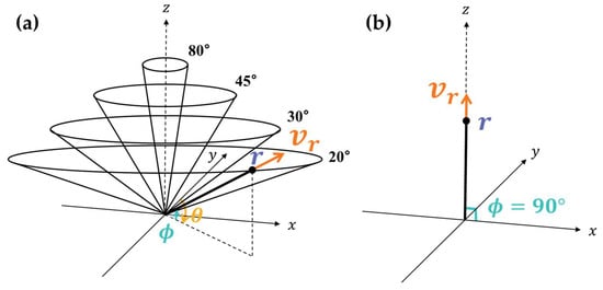 Schematic diagram illustrating the lidar beam’s operation in two scanning strategies: (a) PPI and (b) VP. The represents the observed radial velocity at range , azimuth angles , and elevation angle.