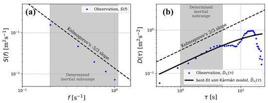 The inertial subrange used for the estimation spans 1 to 5 s, which is consistent with the estimation of . An example of the calculated SF is provided in Figure 4b.