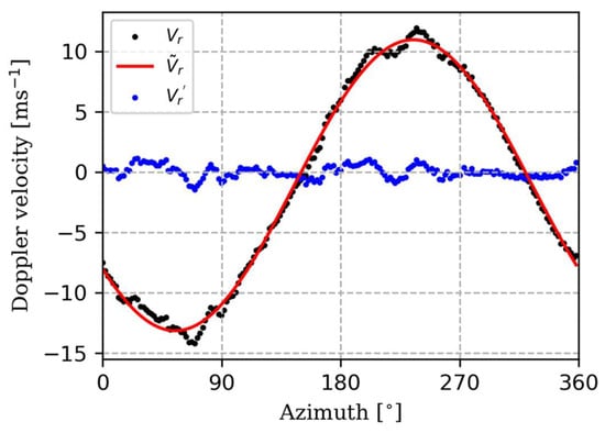 where is the unit vector along the probing beam and represents the mean wind vector estimated through sine wave least-squares fitting using SVD. An example of calculating is illustrated in Figure 5. The observed radial velocity was successfully fitted using SVD. The fitted velocity indicates that the wind speed at the time was ~11 m s−1 and the wind direction was ~50°.