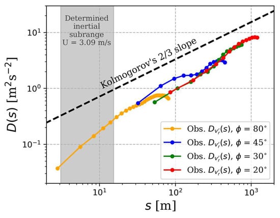 where , with representing the azimuth angle interval. The inertial subrange was selected to align with that used in . Figure 6 illustrates the structure function , based on the VAD technique. To determine the inertial subrange, the same 1–5 s range used in estimating and was multiplied by , resulting in the range of –5 m. In this study, if was within in the determined inertial subrange, the SF values in that region were averaged; otherwise, the values for the smallest were used.