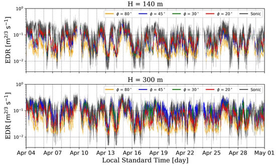 To evaluate the performance of in comparison to with respect to the temporal variations in turbulence intensity, Figure 7 presents the time series for both and at two altitudes (140 m and 300 m) across all elevation angles (20°, 30°, 45°, and 80°). Overall, the measurements across all elevation angles exhibited similar temporal variations to the measurements. As the elevation angle decreases, the estimated EDR generally becomes more similar to those from the sonic anemometer and better capture the variability. The measurement taken at the 80° scan in particular shows slightly lower values compared to the other elevation angles. We also observed typical diurnal variability of the PBL, especially on April 13, characterized by stronger turbulence during the day and weaker turbulence at night. There were also periods with less pronounced diurnal variability, such as on April 17, which were influenced by external factors from low-pressure system passages.