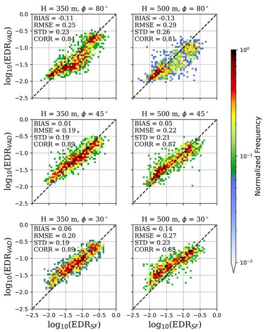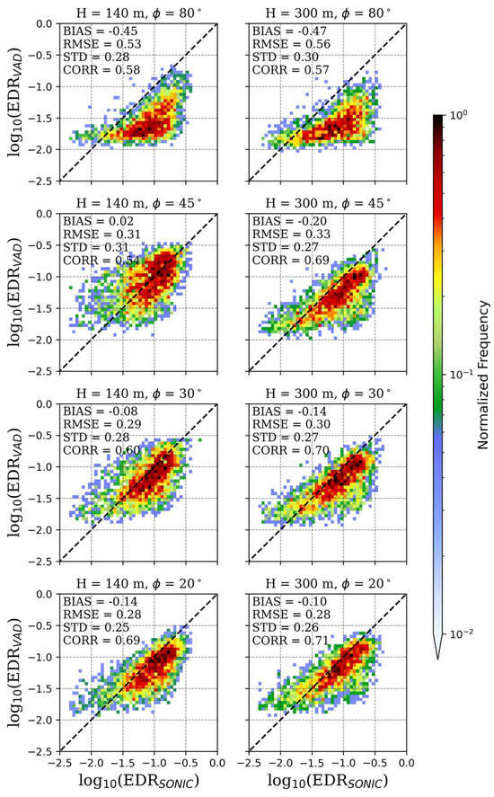 The performance metrics reveal that achieved better performance at lower elevation angles compared to higher ones. The CORR improved as the elevation angle decreased, accompanied by a reduction in standard deviation (STD). At the elevation angle of 80°, a significant bias of −0.45 and −0.47 () was noted at altitudes of 140 m and 300 m, respectively. Higher EDR values exhibited a greater tendency towards underestimation. The variation in bias at elevation angles of 45°, 30°, and 20°—with the exception of 80°—suggests that EDR values tend to decrease (they are underestimated) as the elevation angle decreases at the altitude of 140 m. Conversely, at a 300 m altitude, the underestimation of EDR gradually decreased with lowering elevation angles.