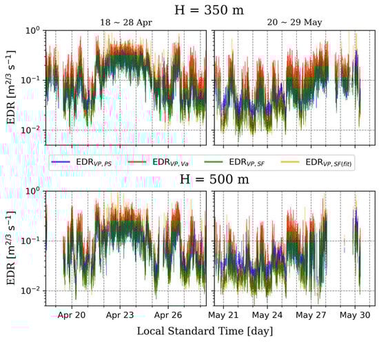 Time series of EDR estimated using the different techniques (PS, SF, Va, SF(fit)) at 350 m and 500 m from the Jeju site.