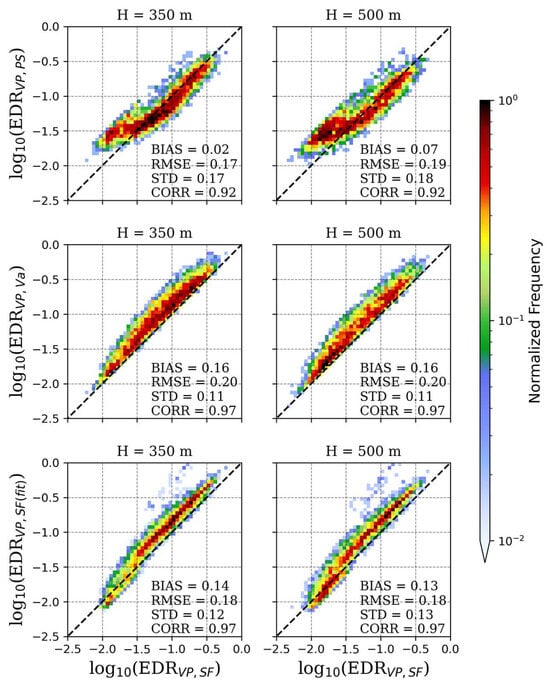 The CORR of is 0.97 at both altitudes, indicating a strong relationship with . However, it has the highest bias (0.16) among all of the techniques. The scatterplot illustrates that shows a more significant difference at higher EDR values compared to lower ones.