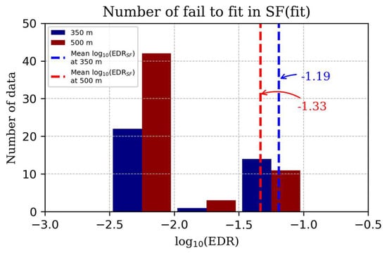 The CORR between and was found to be 0.97 at both altitudes. However, the bias in the estimates was 0.14 at 350 m and 0.13 at 500 m, indicating that the estimates of were generally greater than those from . Because heavily relies on the accuracy of the fitting process, we conducted an additional analysis to investigate the characteristics of cases that did not fit properly. Figure 11 presents a histogram that shows the number of cases that failed to fit during the estimation of , categorized by the magnitude of . The failure in fitting is defined as a case where the optimization process fails to minimize the cost function (Equation (22)). There were 56 failed cases at 500 m and 37 failed cases at 350 m, resulting in success rates of 97.2% and 98.2%, respectively, out of approximately 2000 cases. Most of the failed fits occurred when the turbulence intensity was relatively low compared to the average. Although the number of cases with fit failures is relatively small, these failures in weak turbulence may contribute to the observed positive bias in .