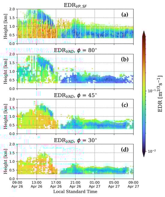 Ref. [7] validated variance-based using data from a sonic anemometer. The findings indicated that when EDR is relatively low (below ), and at a higher altitude of nearly 600 m, lidar tends to underestimate EDR. Ref. [18] validated the EDR derived from the VAD technique () using sonic anemometer data and found that lidar demonstrated high accuracy, generally aligning well with the sonic anemometer measurements (percent bias: −10%). However, they noted that lidar also tended to underestimate EDR when values fell below , particularly in stable atmospheric conditions at night. In a comparative study conducted by [19], and exhibited a similar trend in diurnal variation. Furthermore, comparing at two different elevation angles revealed that lower elevation angles resulted in higher EDR values. While previous research has validated several methods for estimating EDR, the calculation methods differ slightly across studies. Consequently, there remains a need for quantitative comparisons between the various methods.