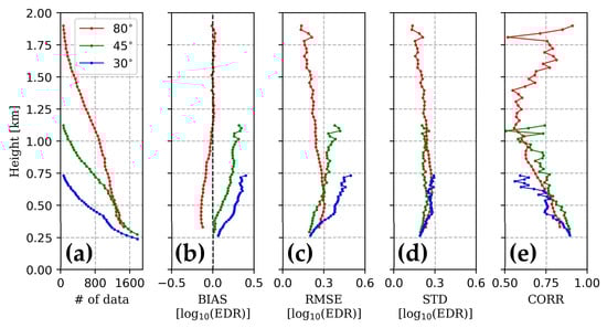Figure 14 illustrates the performance metrics of as a function of altitude. The performance metrics were calculated under the assumption that represents the true value. To ensure the reliability of the analysis, altitudes with fewer than 50 data points were excluded. The number of observed data points indicates that the maximum observable altitude depends on the elevation angle; higher elevation angles allow for higher maximum observable altitudes. The bias tends to increase positively as the elevation angle decreases. Lower elevation angles are characterized by a greater rate of increase with altitude. These characteristics are also evident in the RMSE. At the elevation angle of 80°, RMSE shows a slight decrease with increasing altitude. However, at the other two angles, RMSE increases with altitude, with the most significant rate of increase observed at the lowest elevation angle. The STD is similar across all elevation angles, remaining below 0.3 (). At most altitudes, the elevation angle of 45° exhibits the smallest STD. At the elevation angle of 30°, the CORR is lower than at other angles, while at 45°, it is generally the highest.