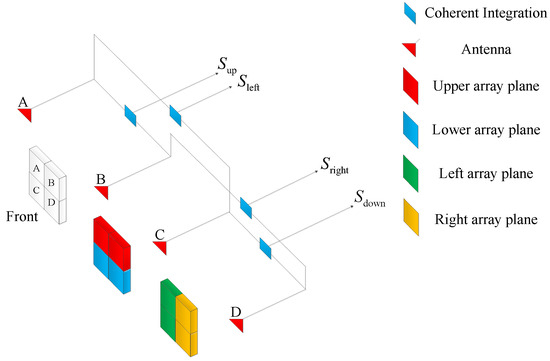 In phased array radars, the LFM echo signals are received, respectively, by four quadrants, which can be regarded as four identical antenna elements. These four signals will be coherently integrated to form four gain region signals , , , and . It is important to note that the radar system under consideration in this work is a ground-based phased array radar system. The schematic of the radar antenna array plane is shown in Figure 1.