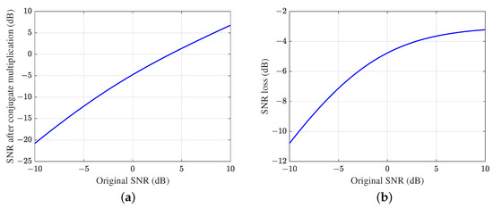 Based on the original signal SNR described by Equation (12) and the post-processed SNR after the conjugate cross-correlation operation specified in Equation (14), we conducted numerical simulations to generate comparative SNR curves before and after the conjugate multiplication processing. Furthermore, we quantitatively analyzed the relationship between SNR loss and the original input SNR, with the simulation results presented in Figure 3. From Figure 3a, it is clear that the SNR of the echoes after conjugate multiplication is significantly lower than that of the original dechirped echoes, indicating a noticeable loss. Figure 3b shows that the SNR loss due to conjugate multiplication decreases as the original echo SNR increases. However, as the original echo SNR continues to rise, the SNR loss approaches approximately 3 dB and then stabilizes. Therefore, in low-SNR environments, the monopulse phase comparison method, which does not involve energy accumulation, experiences a significant SNR loss due to conjugate multiplication, primarily because of the low SNR in the original signal. This is one of the reasons why the phase comparison method requires a higher SNR threshold.