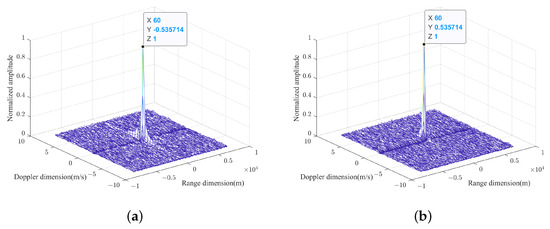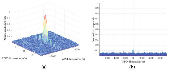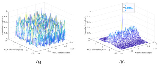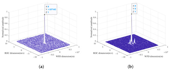 To address this phenomenon, a novel denoising method is proposed. The echo signals from the two quadrants are individually subjected to a two-dimensional Fourier transform to identify the location of the target spectral peak in the Doppler dimension for each signal. Based on the positions of the spectral peak in the Doppler dimension, a filter is then applied in the slow-time dimension to perform denoising. This approach enhances the detection performance, particularly under low-SNR conditions. The effectiveness of the proposed denoising method is demonstrated in Figure 9. The low-SNR conditions in Figure 9 are the same as those in Figure 8 to ensure a consistent comparison across the results. Figure 9a shows the WPD-ROC AF obtained from the cross-correlation of the echo signals without denoising, where no distinct target is visible. Figure 9b shows the WPD-ROC AF after denoising, where a clear spectral peak is observed.