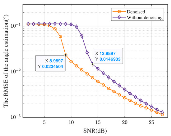 To further validate the effectiveness of the denoising process, a Monte Carlo simulation was conducted. The radar parameters are set as shown in Table 1, with 1000 simulation runs. As shown in Figure 10, the denoising method significantly lowers the SNR threshold for angle estimation compared to the method without denoising.