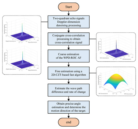 - A maximum likelihood estimate of the angle based on the WPD-ROC-AF is presented, and its Cramér–Rao Lower Bound (CRLB) is derived. To reduce computational complexity, a fast algorithm based on the 2D-CZT is provided, enabling rapid and high-precision estimation of the target’s angle.