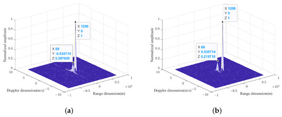 Traditional monopulse angle estimation provides only the target’s angle and lacks information about the target’s motion trend. In contrast, the WPD-ROC AF is introduced in this study, which offers the target’s wave path difference rate, enabling the determination of the target’s motion direction based on the sign of this rate. The radar parameters used in the simulations are listed in Table 1. In two rounds of simulations, the target angles are both , with wave path difference rates of 1 and −1 , respectively. As shown in Figure 17a, the spectrum peak corresponding to Target 1 is located at 1.07 in the ROC dimension. In Figure 17b, the spectrum peak for Target 2 is located at −1.07 . Due to the limited radar bandwidth, which results in large range resolution, the spectral peaks in the WPD dimension are all located at zero, requiring precise estimation for confirmation. By determining the sign of the wave path difference rate and combining it with precise angle estimation, the motion direction of the target can be inferred. Therefore, compared to traditional monopulse angle estimation methods, the proposed method provides more detailed information about the target.