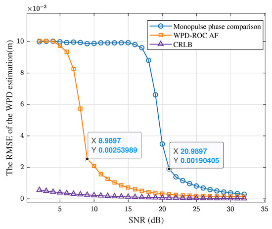 Figure 19 illustrates the relationship between the Root Mean Square Error (RMSE) of the WPD and the SNR for both the monopulse phase comparison angle estimation method and the proposed joint angle estimation method. It is evident that the proposed method achieves higher estimation precision than the monopulse method, with a lower SNR threshold, thus offering better performance even at low SNR levels. Moreover, as the SNR increases, the WPD estimation precision of the proposed method approaches the corresponding CRLB.