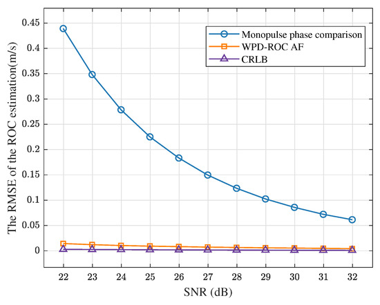For conventional phase comparison monopulse angle estimation methods, the ROC can be indirectly estimated by temporally differencing consecutive WPD measurements derived from angle estimates. The simulation results of this differential estimation approach are shown in Figure 21. The results demonstrate that the RMSE of this differential approach significantly exceeds both our proposed joint estimation method and the theoretical CRLB. This indicates that the cascaded process inevitably amplifies estimation errors while also highlighting the superiority of the proposed method in wave path difference rate estimation.