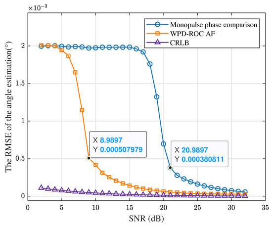 Figure 22 shows the relationship between the RMSE of angle estimation and the SNR for both the monopulse phase comparison method and the proposed method. The CRLB for angle estimation is derived from the CRLB of wave path difference, as given in Equation (1).