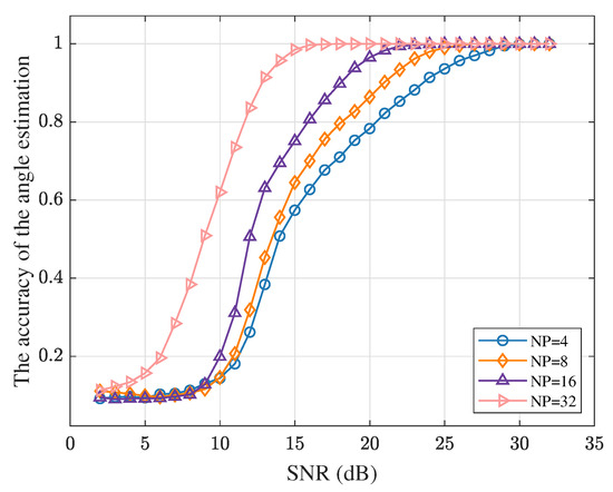 To examine the effect of pulse accumulation on the estimation performance of the proposed joint angle estimation algorithm, Monte Carlo simulations were conducted with pulse counts of 4, 8, 16, and 32 while keeping the target angle and radar parameters constant. The performance comparison is shown in Figure 24 and Figure 25. Figure 24 illustrates the angle estimation precision, demonstrating that as the number of pulses increases, the algorithm’s estimation precision improves, and the SNR threshold decreases, resulting in better performance in low-SNR conditions. Figure 25 shows the simulation results of the angle estimation accuracy, indicating that a higher pulse count improves the probability of achieving precise estimations under the same SNR conditions. In conclusion, increasing the pulse count allows for more energy accumulation, which gradually enhances the algorithm’s estimation performance.