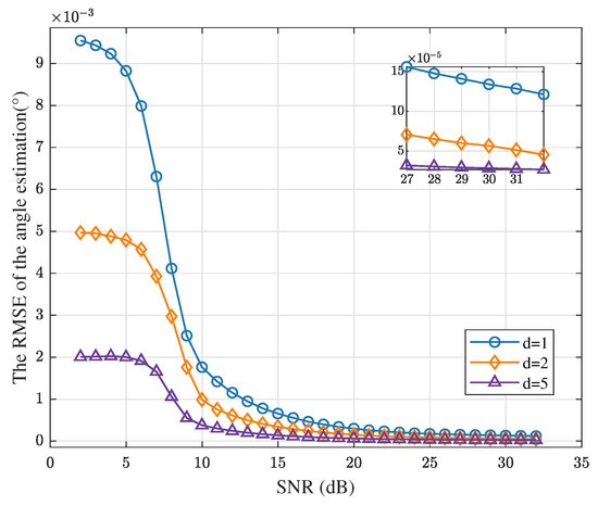 To examine the effect of quadrant array spacing on the estimation precision of the proposed joint angle estimation algorithm, the array spacings are set to 1 , 2 , and 5 , with other parameters fixed as specified in Table 1. Monte Carlo simulations are conducted under the same conditions for all three setups. The RMSE of the angle estimation results is shown in Figure 26. As observed, increasing the array spacing improves the angle estimation precision while having little effect on the SNR threshold.