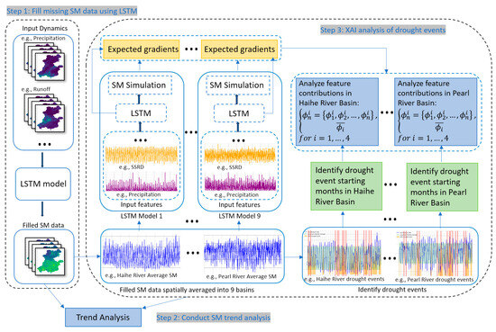 This study employed a structured approach to achieve three primary objectives, as illustrated in Figure 2. The first step involved addressing the missing values in the ESA CCI SM dataset, which was provided at eight-day intervals for the nine basins from 1981 to 2023. An LSTM model was utilized to reconstruct the missing values, leveraging its ability to capture temporal dependencies in the time series data. This step produced a continuous and reliable SM dataset, which served as the foundation for subsequent analyses. Using the reconstructed SM dataset, we conducted a 43-year trend analysis to investigate the long-term variability across the study area. This analysis identified spatial and temporal patterns in SM trends, providing insights into regional differences and enabling a deeper understanding of the mechanisms driving droughts. To assess the factors contributing to SM changes during drought events, we applied the Expected Gradient (EG) method, an explainable artificial intelligence approach. This method is grounded in SHapley Additive exPlanations (SHAP) values, allowing us to quantify the relative contributions of the key hydrometeorological variables to SM variability.