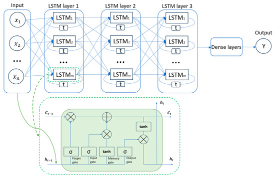 In each LSTM layer, the model relied on the architecture of the LSTM cells to learn the input feature sequence data patterns. As shown in Figure 3, a single LSTM cell consisted of three input streams, including the previous hidden state (), the previous cell state (), and the current input features (). Based on the current input and the previous hidden state, a multilayer perceptron was used to calculate four internal gates, including the forget gates (), input gates (), candidate cell states (), and output gates (). These gates determined the information to be retained, updated, or discarded as the sequence progresses. The determined which information to discard from the cell state:
