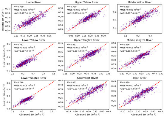 The LSTM model successfully addressed gaps in the ESA CCI SM dataset, achieving high accuracy in reconstructing the SM values. The model achieved an R2 of 0.928, with a RMSE and a MAE of 0.02 and 0.015 m3m⁻3, respectively. To evaluate the model consistency across basins, 1000 random samples from each basin’s test dataset were analyzed. Figure 4 illustrates the model performance in each basin. The highest R2 was observed in the Middle Yangtze River Basin (R2 = 0.866), while the Pearl River Basin showed a median R2 of 0.820. The lowest R2 was in the Lower Yangtze River Basin (R2 = 0.748). Despite these regional variations, the model demonstrated robust performance across all basins, maintaining low RMSE and MAE values.