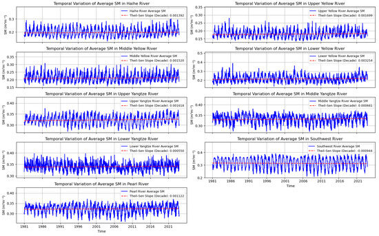 The analysis of soil moisture values from 1981 to 2023 revealed distinct variations among the basins and temporal variations across the nine major basins in China, as illustrated in Figure 7. The Yangtze River Basin, Southwest River Basin, and Pearl River Basin demonstrated notably higher SM values, whereas the Haihe River Basin and Yellow River Basin showed relatively lower values. This spatial pattern coincided with precipitation distributions depicted in Figure 1, where greater precipitation occurred in the southern regions. The temporal variations showed pronounced seasonal fluctuations in all basins. The long-term changes remained modest, as evidenced by the small magnitude of Theil–Sen slope values.