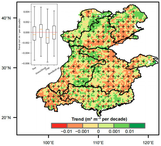 Spatial distribution and land cover analysis of SM trends with regional SM trend patterns (statistically significant trends at p < 0.05 are marked by ‘+’) and box plot distributions of SM across different land cover types.